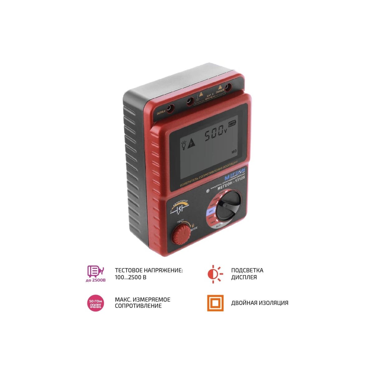 Тестовое напряжение: 100, 250, 500, 1000, 2500 В