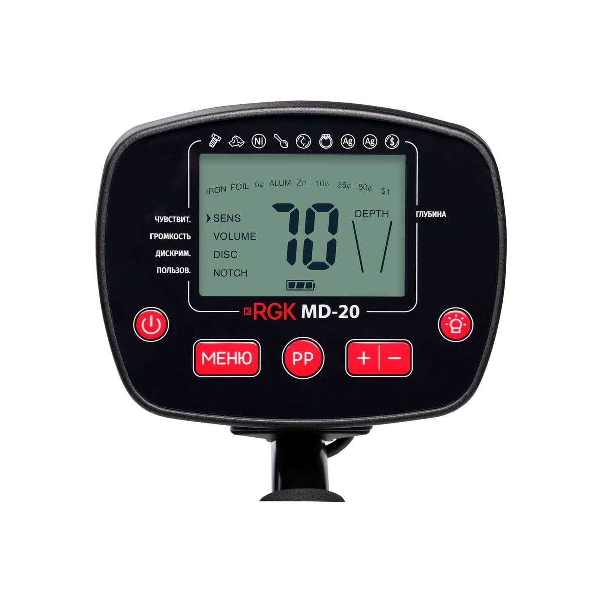 Металлоискатель RGK md-20 754880 - современный универсальный прибор для поиска черных и цветных металлов, монет, реликвий, исторических артефактов. Эта модель комплектуется моно-катушкой диаметром 26 см, которая отличается больше, чем у датчиков формата DD, глубиной обнаружения.