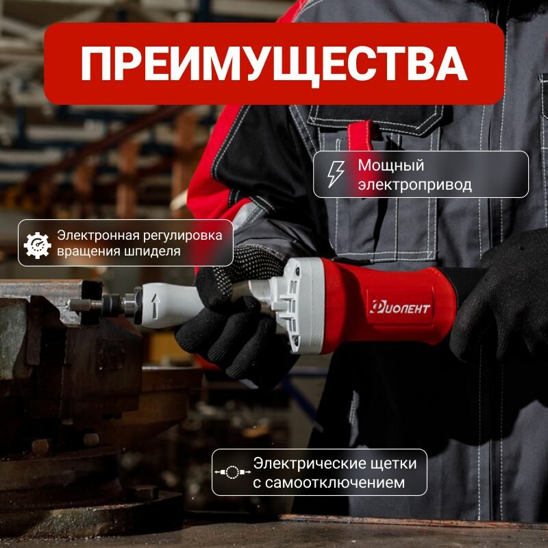 Компактная, легкая и мощная прямошлифовальная машина с бронированными обмотками, высокоскоростными подшипниками, уникальной конструкцией цангового патрона, с плавным пуском, регулировкой оборотов и их поддержанием под нагрузкой (константная электроника).