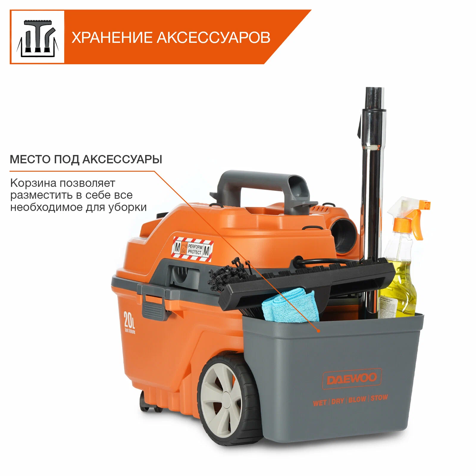 Общие характеристикиБрендDaewoo Power ProductsЦвет товараоранжевыйТиппрофессиональный пылесосТип уборкивлажная, сухаяДополнительные функцииработа на выдув, регулировка мощности, функция сбора жидкостиТруба всасываниятелескопическаяКомплектациянасадка для пола, пылесборник-пакет, трубка удлинительная, шланг, щелевая насадкаТип пылесборникаконтейнер, мешокОбъем бака/пылесборника20 лТруба всасываниятелескопическаяМощность1500 ВтРасход воздуха3000 л/сВстроенная розеткаестьДлина шланга4 мДлина кабеля5 мКласс пылиMРазрежение250 мБарСистема очистки фильтраручнаяВес1.5 кгДополнительная информацияКорзина для аксессуаров