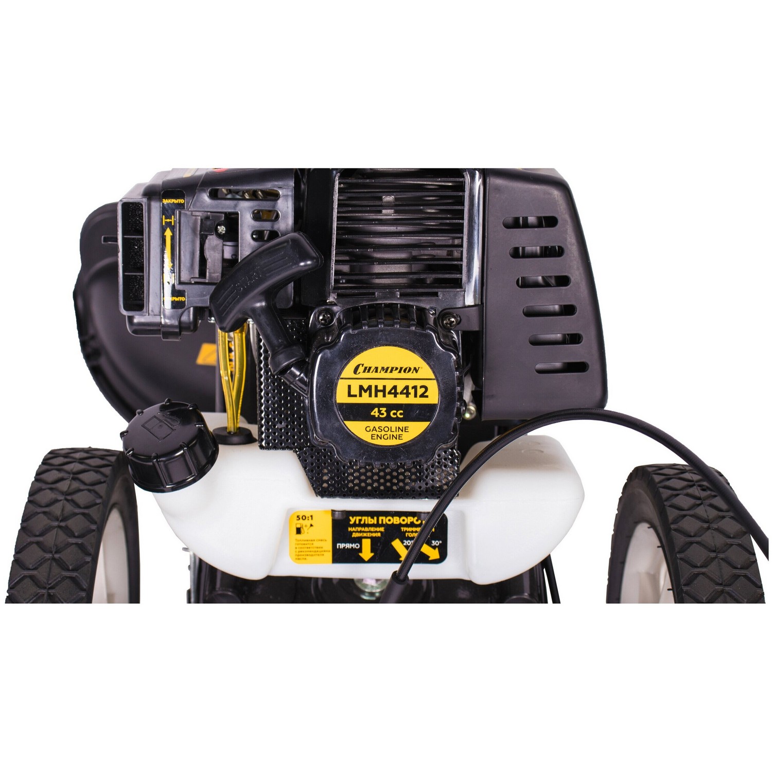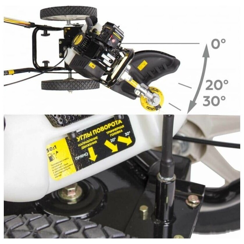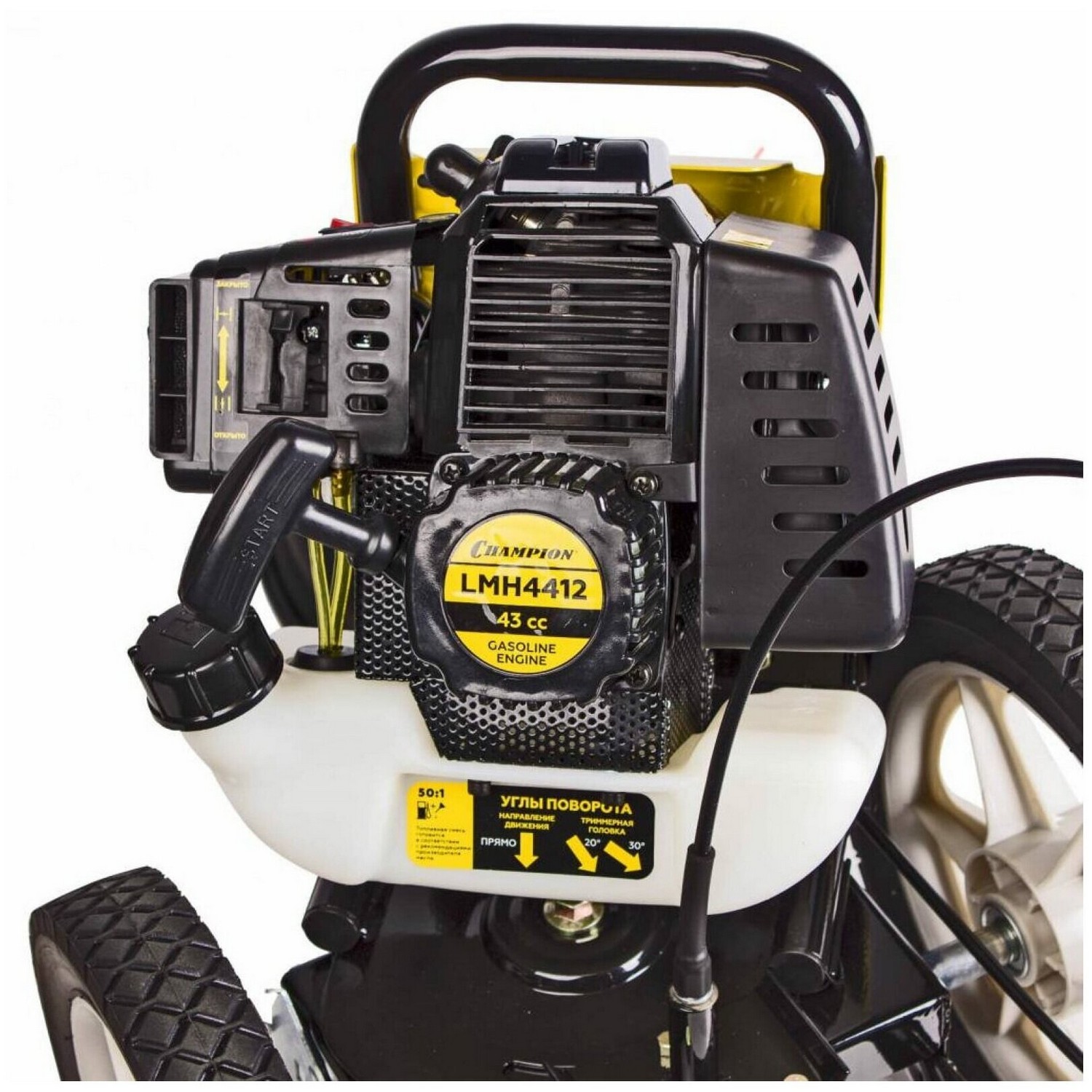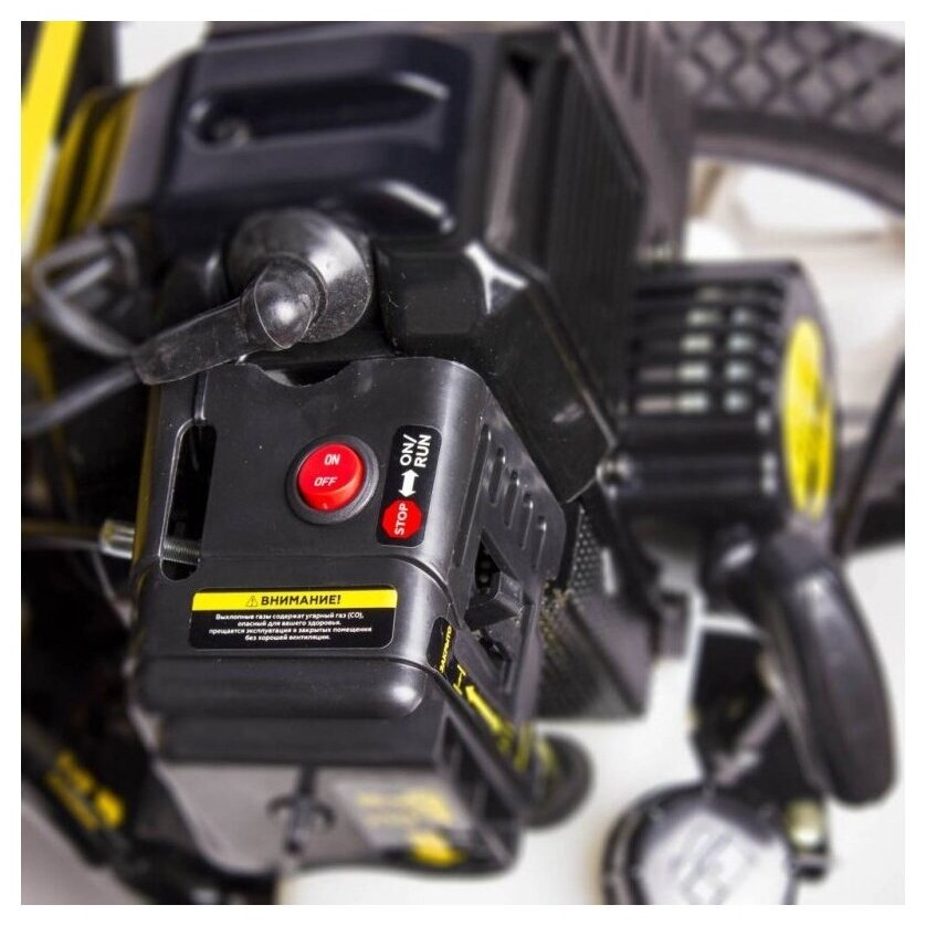 Бензиновый одноцилиндровый 2-х тактный двигатель с воздушным охлаждением. Праймер - легкий запуск мотора. Кожух предотвращает вылет скошенной травы. Удобно расположенная на корпусе двигателя кнопка зажигания позволяет остановить работу двигателя одним нажатием.