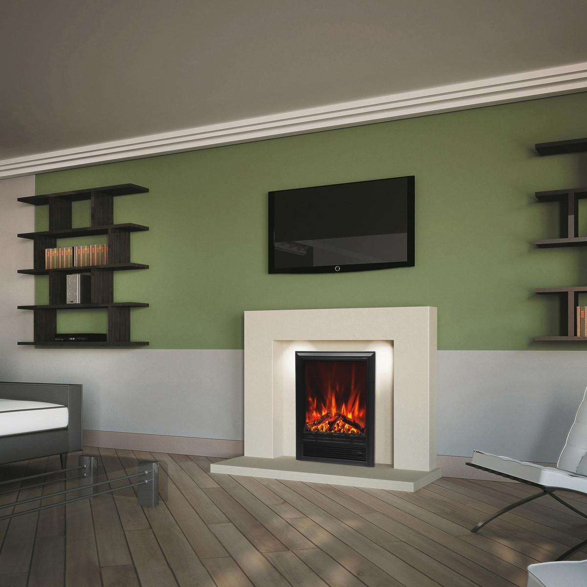 Электрический камин RealFlame Eugene - это обязательный предмет интерьера для вашей гостиной, кухни, спальни или прихожей его предназначением является украшение и декорация вашего дома или офисного помещения. Достигается это посредством имитации пламени на экране очага и конвекторного обогревателя встроенного в корпус. Двухуровневый тепловентилятор обогреет за полчаса любое помещение - спальню, кухню, его можно просто поставить на пол или встроить в каминное обрамление, в нишу или в мебель - есть датчик защиты от перегрева. Камин используют в любую погоду зимой, осенью или весной, в квартире или на даче. Летом можно не включать обогрев - проекционная технология пламени имитирующая настоящий огонь работает в независимом режиме. У электрического очага Eugene по мимо звуковой имитации потрескивания дров есть дополнительные особенности: Пульт ДУ, регулировка яркости пламени, таймер отключения. Камин достаточно универсален в выборе стиля и дизайна оформления помещения.