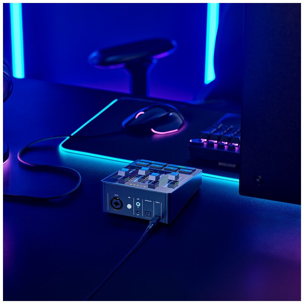 Razer Chroma RGB для всех кнопок (кроме кнопки фантомного питания 48 В), возможность настройки числа каналов и уровня громкости в Razer Synapse.