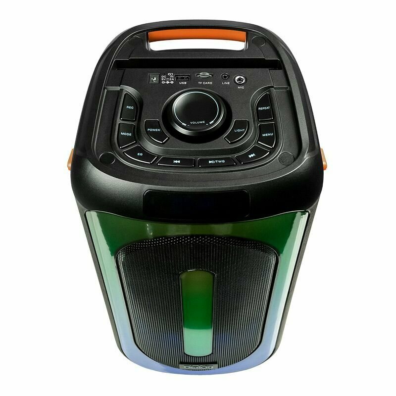 Управлениена верхней панели: питание, следующая запись/радиостанция, предыдущая запись/радиостанция, воспроизведение/пауза/TWS, выбор режима (источника звука), меню, общая громкость, запись с микрофона, цветомузыка, повтор воспроизведения, эквалайзер