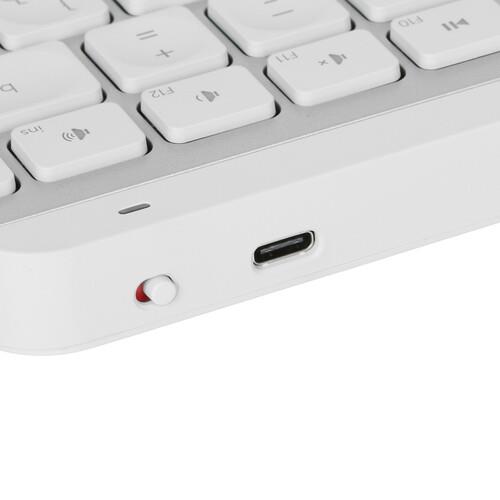 Стильное устройство Logitech MX Keys Mini Pale Grey дополнено белой подсветкой, автоматически подстраивающейся под освещение в комнате. Вы можете включить интеллектуальный режим, чтобы подсветка активировалась при приближении рук к клавиатуре. Также модель дополнена горячими клавишами с функциями вставки эмодзи и диктовки (расшифровка речь в текст). Прибор заряжается через USB-кабель, работая на полном заряде АКБ до 10 дней или до 5 месяцев с отключенной подсветкой.