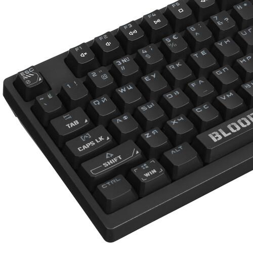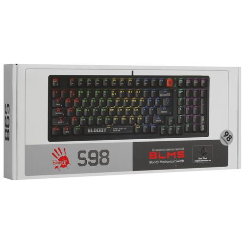 Клавиатура проводная A4Tech Bloody S98 Black выдерживает до 50 млн кликов. Переключатели Bloody BLMS Red Plus не издают громких звуков при нажатии и уменьшают нагрузку на пальцы. Кейкапы изготовлены из пластика высокой жесткости, устойчивого к истиранию символов. Исключить ошибки ввода позволяет интегрированная RGB-подсветка.