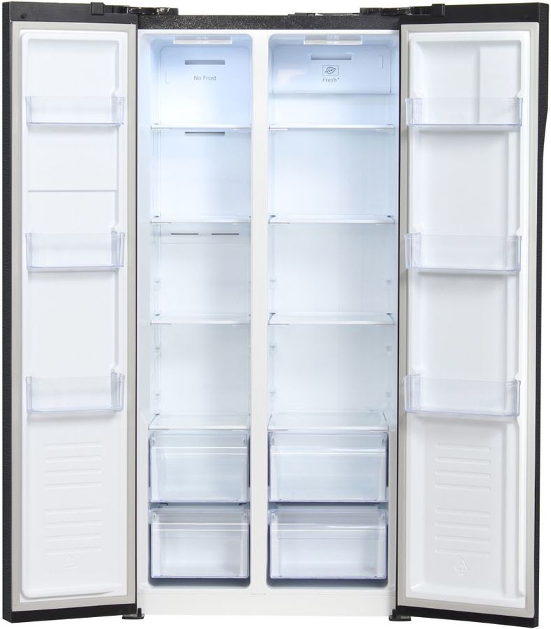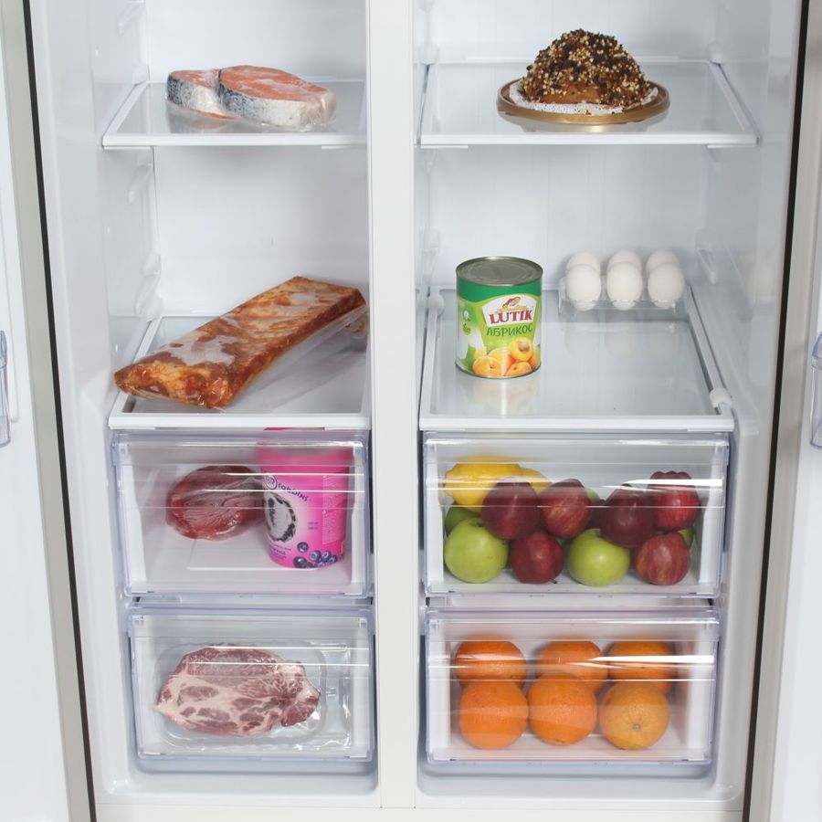 количество камер: двухкамерный; расположение морозильной камеры- сбоку (Side by Side), размораживание морозильной камеры- No Frost, защита от детей, цвет: нержавеющая сталь
