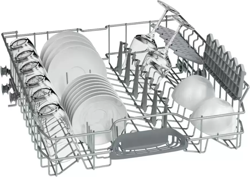 - Корзина для столовых приборов, полочка для чашек в верхнем коробе и направляющие для тарелок в нижнем коробе обеспечивают удобное размещение посуды.