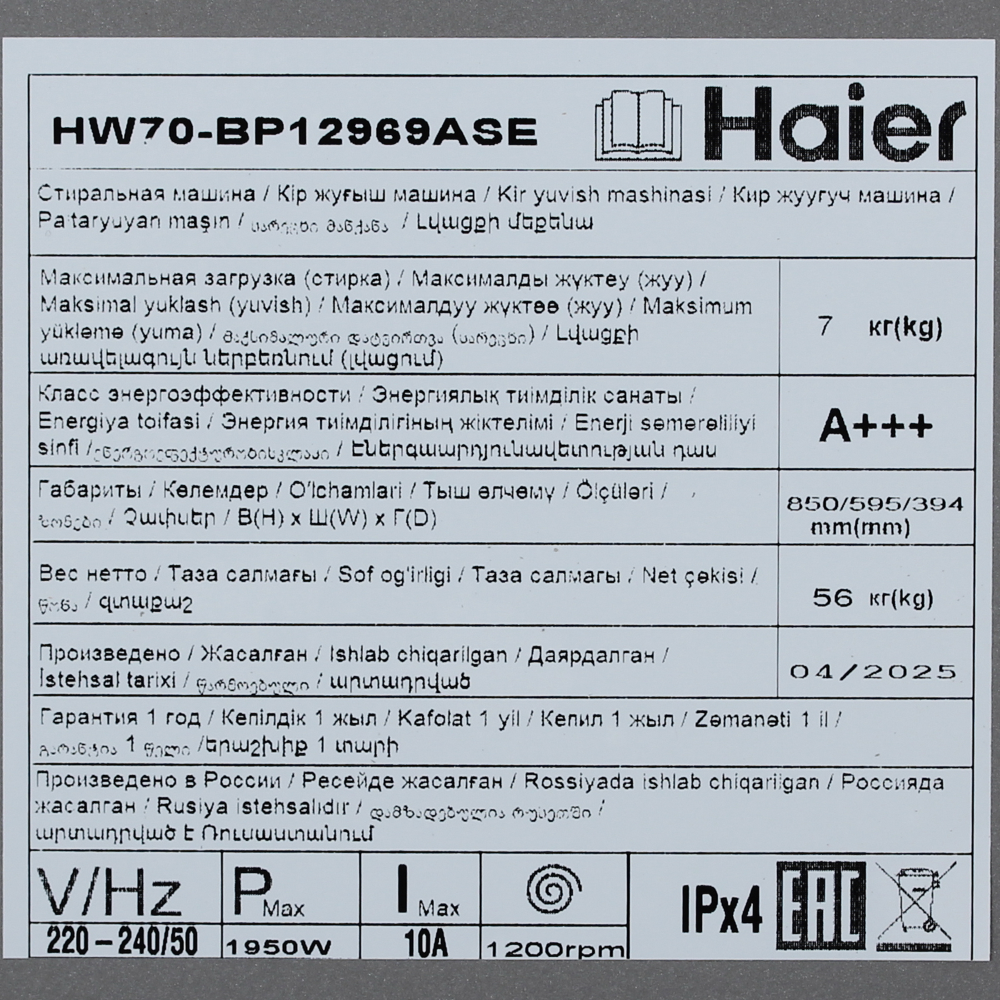 Haier HW70-BP12969ASE производится в России. Гарантия от производителя составляет 12 месяцев. Срок эксплуатации – 84 месяца. Бак выполнен из нержавеющей стали. Это гарантирует долгий срок службы. Предусмотрена защита от протечек и блокировка от детей. Вы можете быть уверены в безопасности.