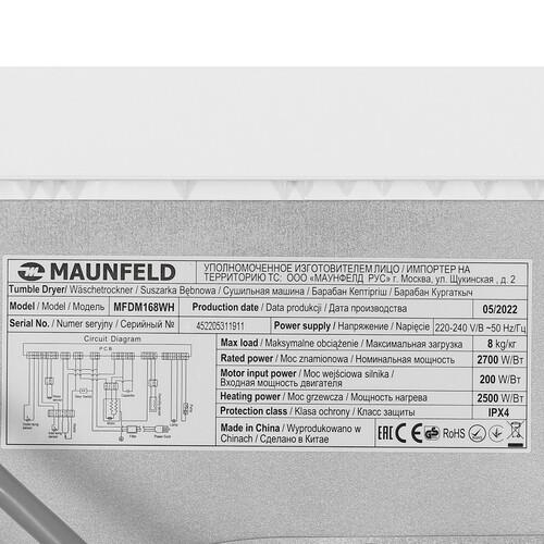 В барабан машины MAUNFELD MFDM168WH можно поместить до 8 кг влажного белья. Благодаря поддержке 16 программ можно выбрать оптимальный режим сушки в зависимости от типа ткани. Управление устройством реализовано через электронную панель с дисплеем и кнопками. Для выбора программы используется поворотное колесо.