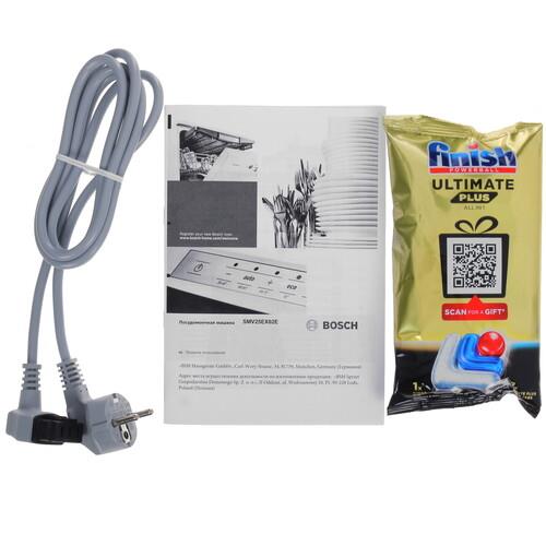 Bosch SMV25EX02E поддерживает 5 программ мойки и 4 температурных режима. Предусмотрен режим сокращения длительности программ, что позволяет экономить время. Для сушки устройство задействует теплообменник: в результате циркуляции воздуха внутри аппарата капли воды испаряются. Для размещения посуды внутри машины установлены 3 корзины. Регулировка верхнего короба по высоте позволяет оптимизировать внутреннее пространство. Нижний короб имеет направляющие для удобного размещения тарелок.