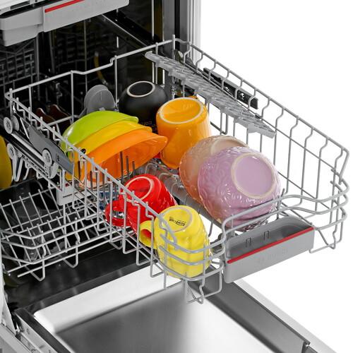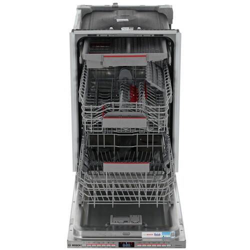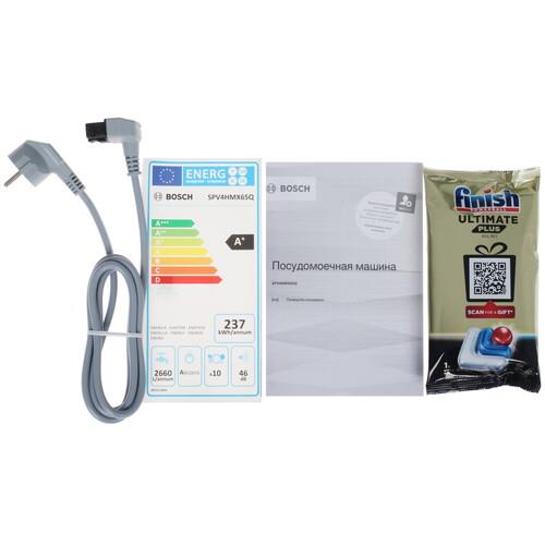 На панели управления из нержавеющей стали расположены электронные кнопки и цифровой дисплей. Функция Home Connect предоставляет возможность удаленной настройки параметров посудомоечной машиной Bosch SPV4HMX65Q через приложение на смартфоне по Wi-Fi. Инверторный двигатель EcoSilence Drive за счет отсутствия щеток обеспечивает тихую работу и экономичное потребление энергии. Система AquaStop перекрывает подачу воды при обнаружении неисправности шланга и протечек в корпусе.