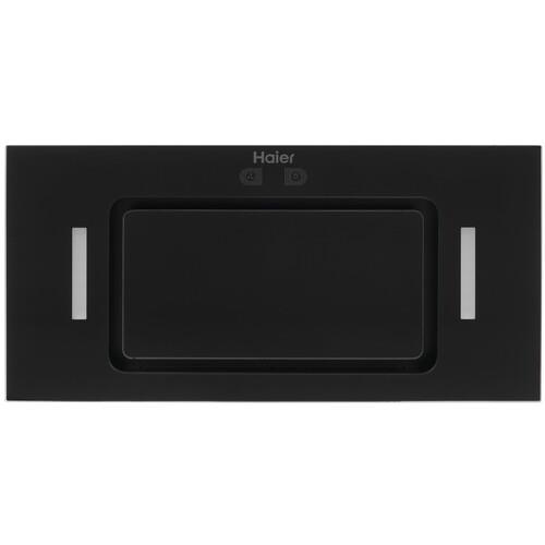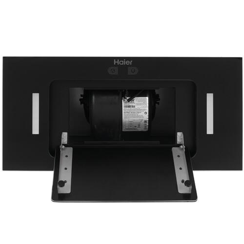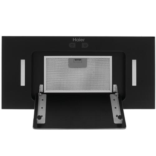 За стеклянной панелью Haier HVX-BI652GB расположен металлический жироулавливающий фильтр. Дополнительно можно расположить угольный фильтр от неприятных запахов. Яркая подсветка с двумя светодиодными лампами освещает пространство в темноте.