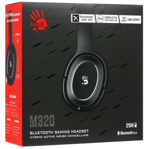 Bluetooth-гарнитура A4Tech Bloody M320 в черном цветовом оформлении отлично подойдет для геймера благодаря эффектному дизайну и высокой скорости передачи звука по беспроводному каналу. Модель подключается к ПК, ноутбуку или смартфону по беспроводному интерфейсу Bluetooth 5.0 и поддерживает связь с устройством на расстоянии до 10 м. В стереогарнитуре предусмотрены 40-миллиметровые динамики с поддержкой передачи звуков в диапазоне частот 20-20000 Гц. Амбушюры из черной экокожи гарантируют комфорт и хорошую звукоизоляцию.