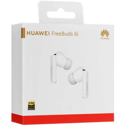 TWS гарнитура Huawei Freebuds 6i представлена в белом цвете. Конструкция с классом защиты IP54 делает ее устойчивой к пыли и влаге. Благодаря съемным мягким вкладышам наушники удобны в использовании и прочно удерживаются в слуховом канале.