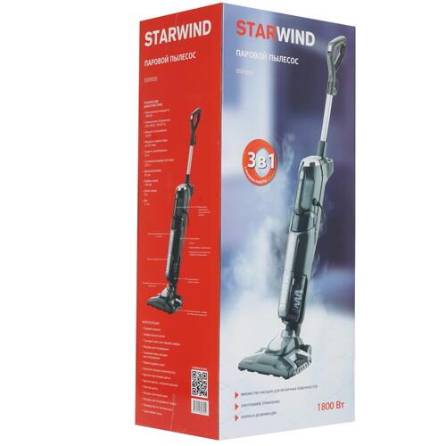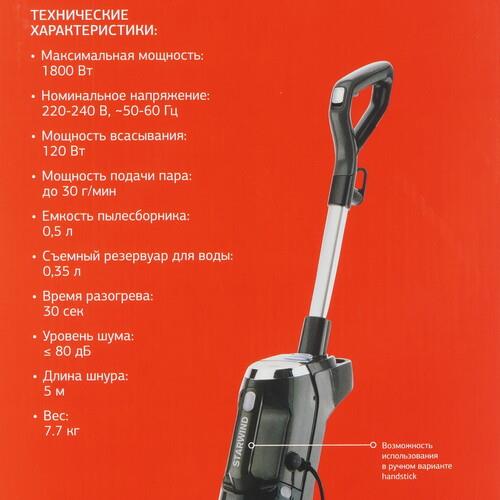 Вертикальный пароочиститель Starwind SSV9555 представлен в сером корпусе с индикатором включения и кнопками управления. Устройство с мощностью 1800 Вт требует всего 30 секунд для нагрева до нужного уровня. Емкости на 350 мл хватает примерно на 10 минут работы без долива воды.