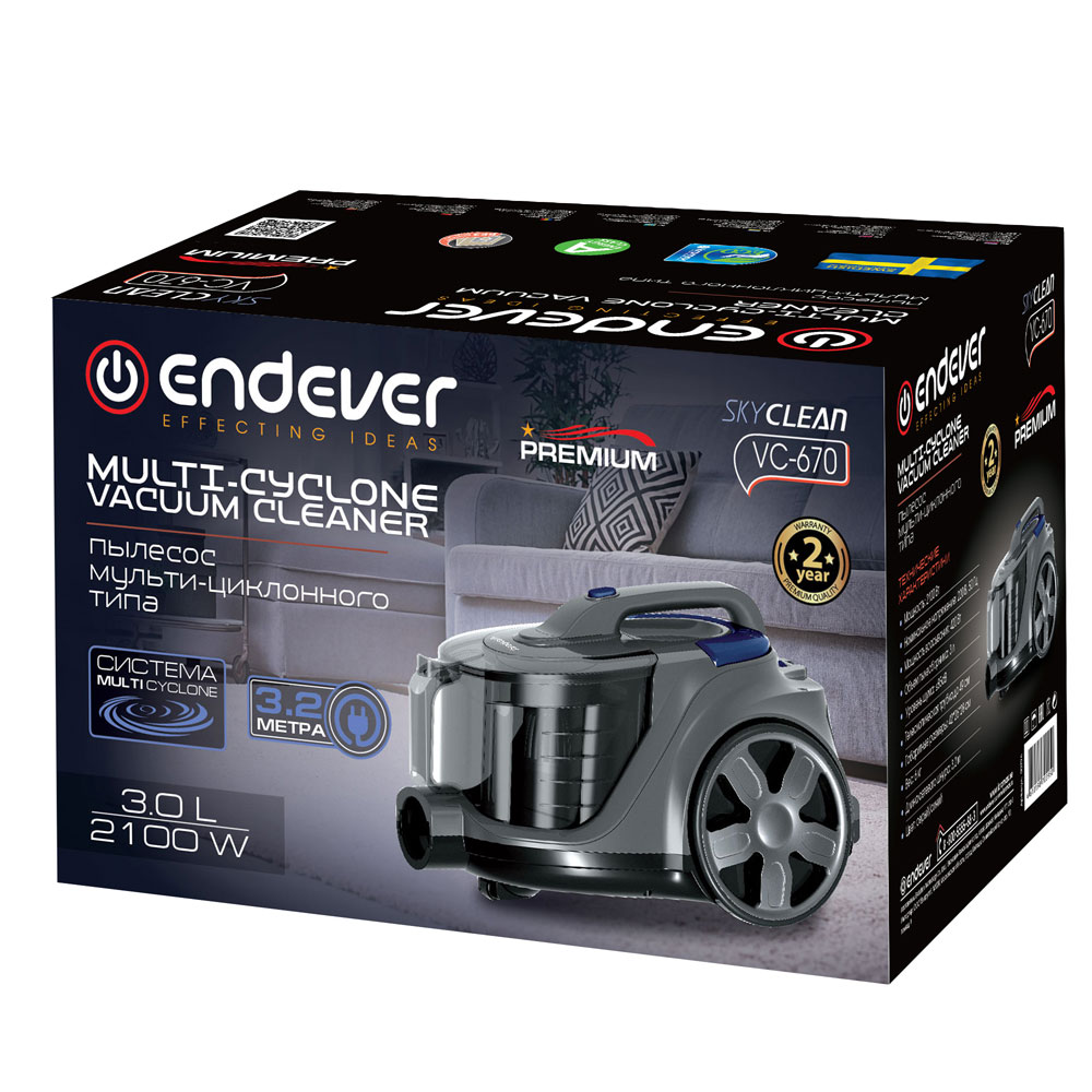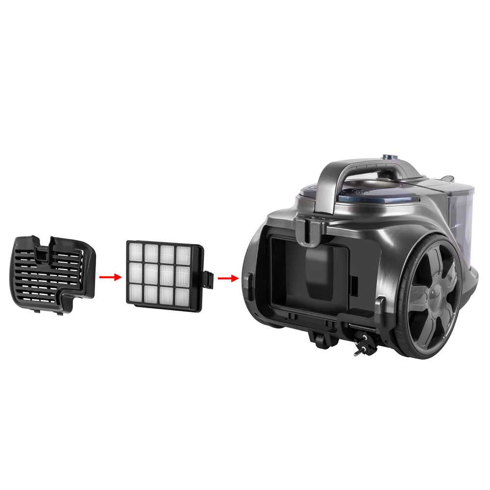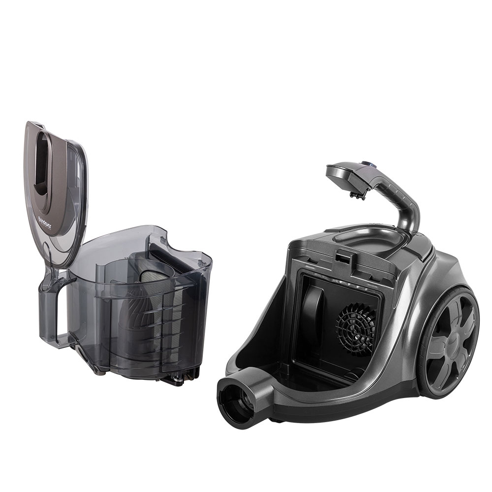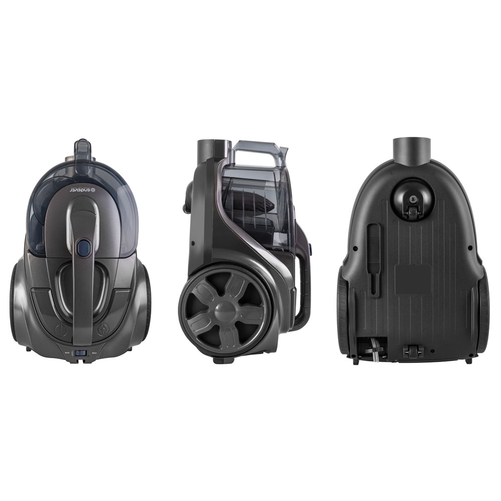 Тип уборки – сухая, Вместительный резервуар для мусора, Гибкий шланг с регулятором воздушного потока на ручке, Инновационное строение корпуса и фильт ров, минимизирующее уровень шума, Кнопка для автоматической смотки шнура, Моющийся циклонный фильтр, Крепление для парковки трубы, Колеса с резиновым покрытием