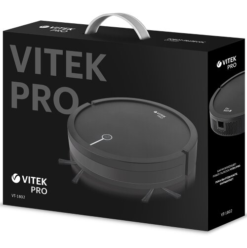 Робот-пылесос Vitek VT-1802 работает от литиево-ионного аккумулятора Li-ion и способен непрерывно функционировать на протяжении 2 ч. Время полного заряда батареи составляет 5 ч. Модель характеризуется низким уровнем шума, что создает комфортные условия при ежедневном использовании. Для эффективного удаления загрязнений из труднодоступных мест есть четыре боковые щетки. На верхней части устройства есть индикация застревания и степени заряда аккумулятора.
