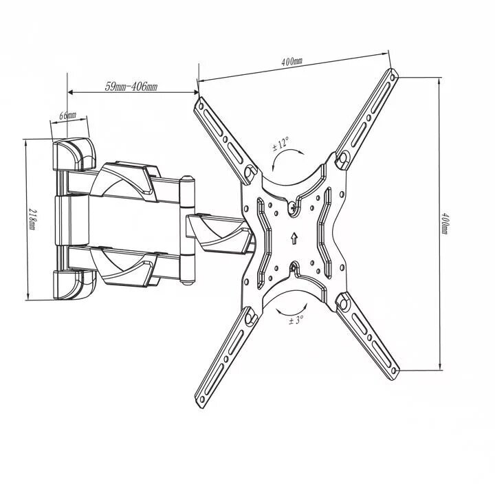 Шарнирное соединение с подвижным коленом дает возможность поворота экрана до 90 градусов влево-вправо (угол поворота зависит только от диагонали телевизора), а также позволяет регулировать расстояние от телевизора до стены от 59 до 406 мм.