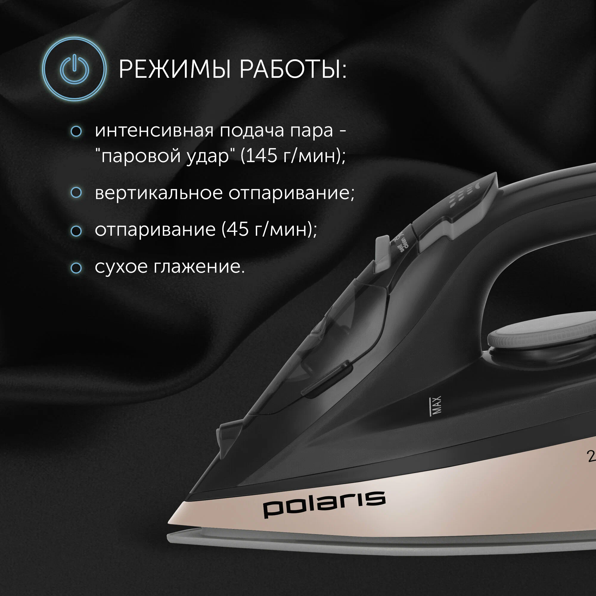 паровой удар, постоянная подача пара, регулировка подачи пара, регулировка температуры, сигнал автоотключения, система самоочистки, сухая глажка