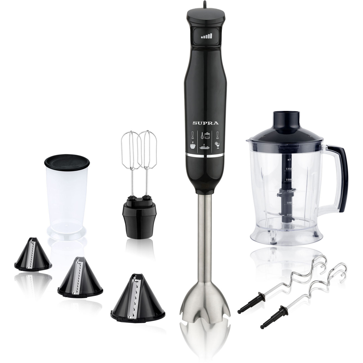 Комплектацияблендер, съемная насадка-блендер из нержавеющей стали, венчики для взбиваия, крючки для теста, измельчитель с конусными насадками 1,25 л., мерный стакан с крышкой 500 мл., инструкция на русском языке, гарантийный талон