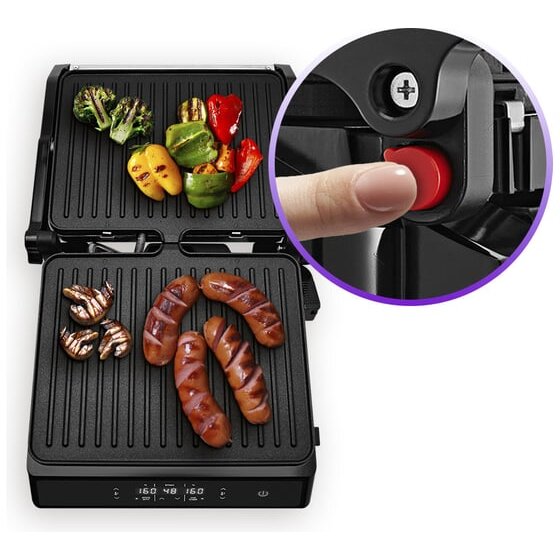Конструкция гриля позволяет готовить в трех режимах: двустороннем, одностороннем и с приоткрытой крышкой. В двустороннем режиме гриль закрывается крышкой, благодаря чему продукты находятся между двух нагреваемых панелей и готовятся с двух сторон. В режиме приготовления с приоткрытой крышкой верхняя нагреваемая панель опускается не до конца, что полезно при готовке продуктов, которые могут потерять форму из-за давления крышки. В одностороннем режиме крышка гриля откидывается на 180°, благодаря чему гриль превращается в большую жаровню, а продукты можно выложить сразу на две панели. Данная модель оснащена поддоном для слива жира и сока, которые выделяются в процессе приготовления продуктов.