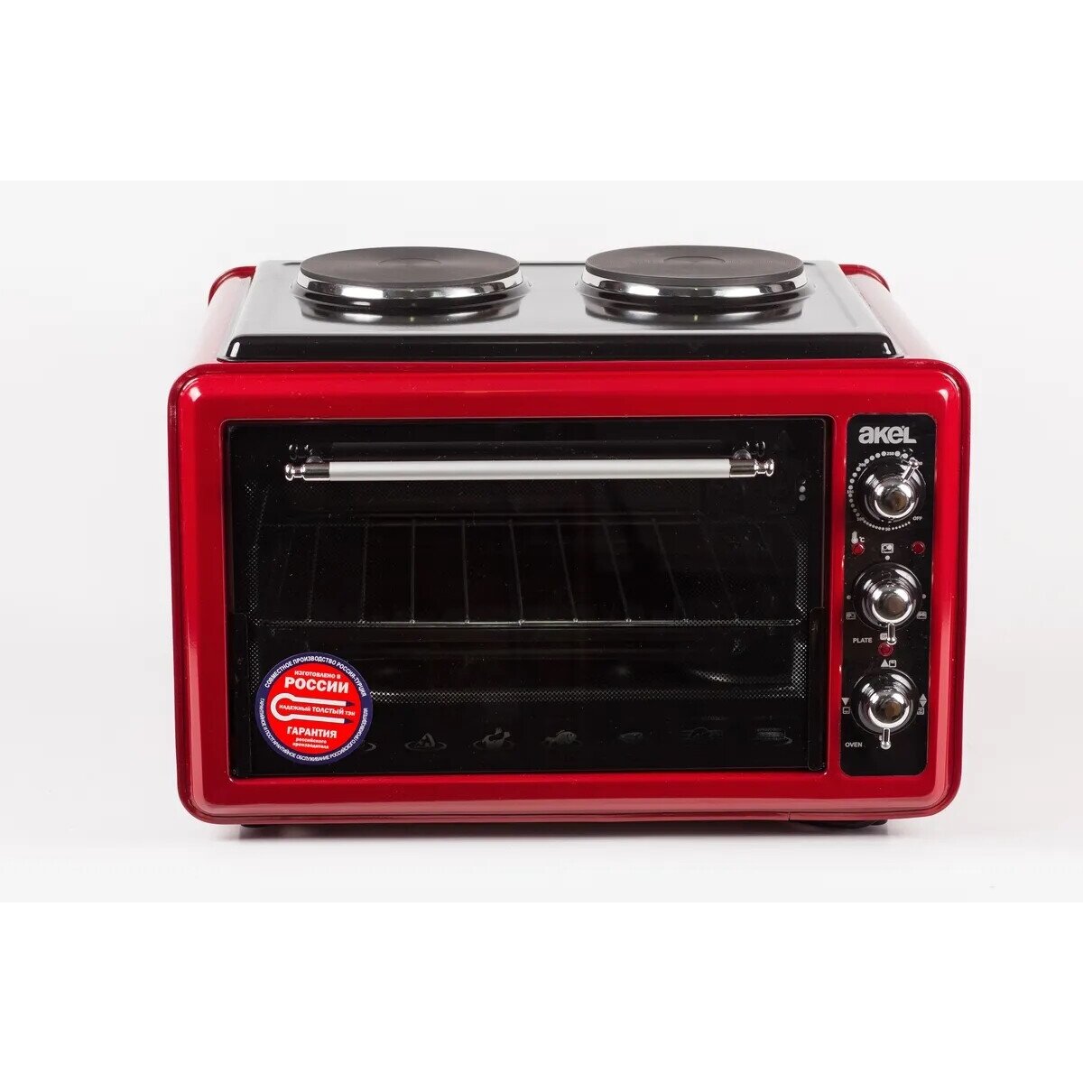 * Производитель: Akel * Цвет: красный * Тип прибора: мини-печь * Внутренний объем: 36л * Максимальная мощность: 3300Вт * Количество конфорок: 2 * Максимальная температура: 250°С * Количество режимов работы: 3 * Конвекция: Нет * Гриль: Нет * Вертел: Нет * Внутреннее покрытие камеры: эмаль * Открытие двери: откидное * Управление: механическое * Дисплей: Нет * Таймер: Да * Максимальное время таймера: 60мин * Особенности: защита от перегрева индикатор работы подсветка камеры ручка с защитой от нагревания термоизолированый корпус функция разогрева * Комплектация: круглый противень прорезиненные ножки противень решетка * Ширина: 60см * Глубина: 30см * Высота: 44см * Вес: 11.5кг