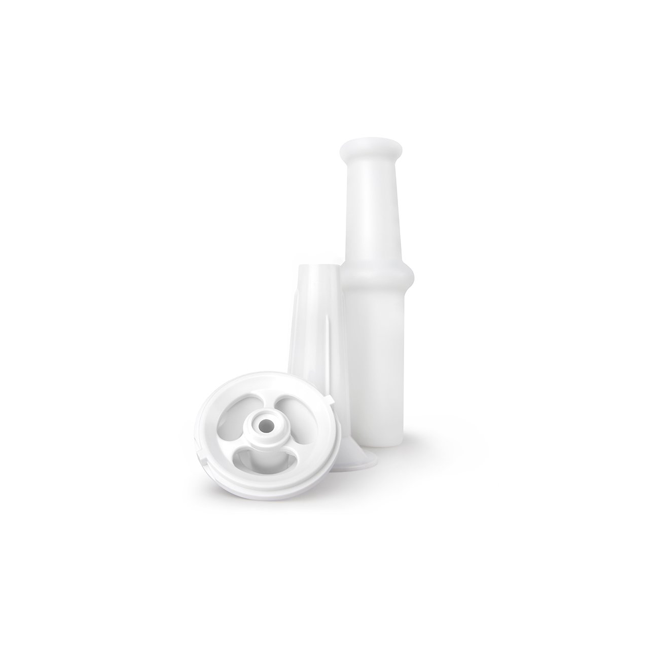 В комплект прилагаются руководство по эксплуатации, две решётки для мясорубки с пропускными отверстиями 5 и 8 мм., пластиковый толкатель, насадка для сосисок и насадка «КЕББЕ».