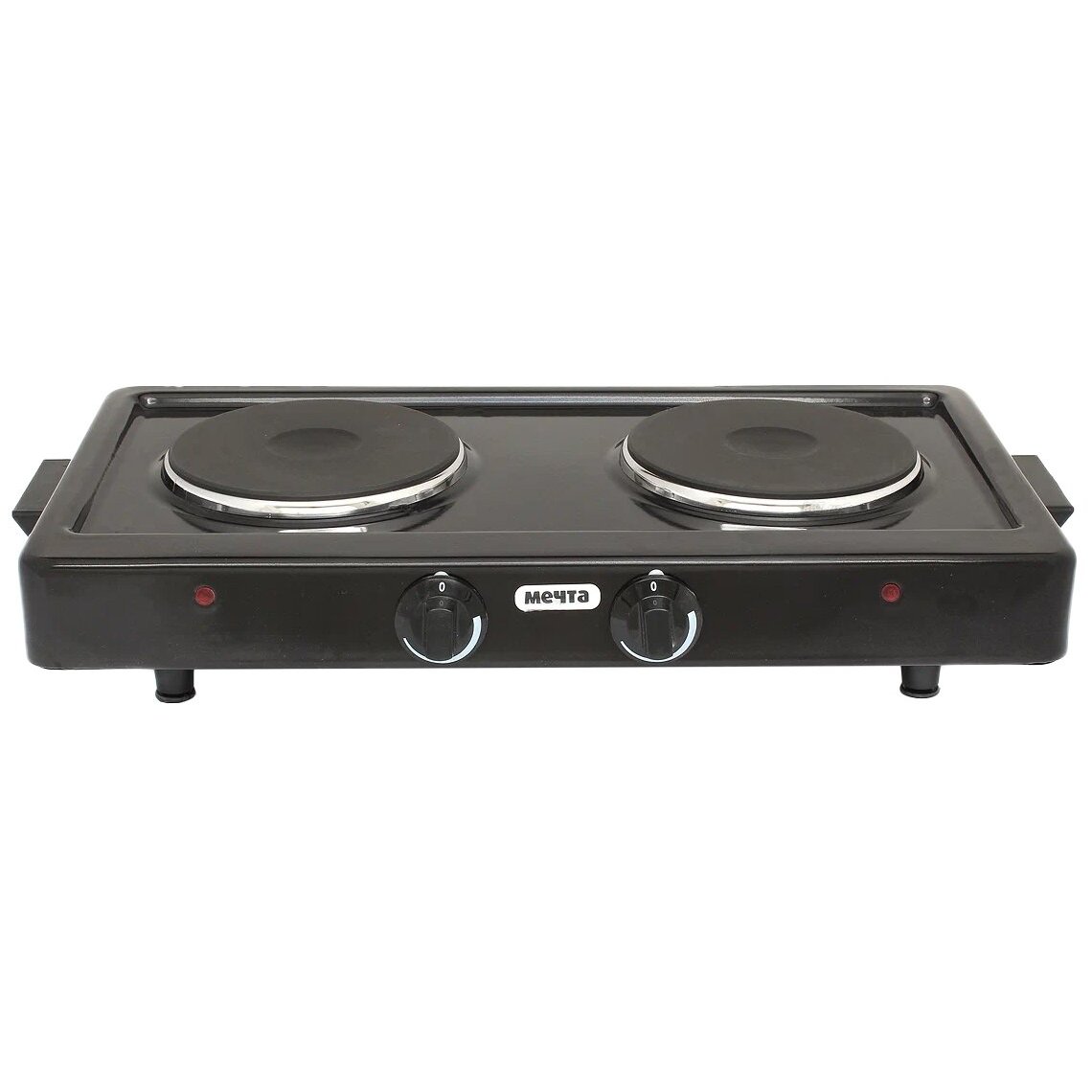 тип конфорок: чугунные; мощность каждой конфорки: 1 кВт, диаметр 14,5 см; бесступенчатое регулирование мощности; индикация включенного состояния электроконфорок; опорные ножки плитки оборудованы вкладышами противоскольжения; стеклоэмалевое покрытие; вес 4,5 кг