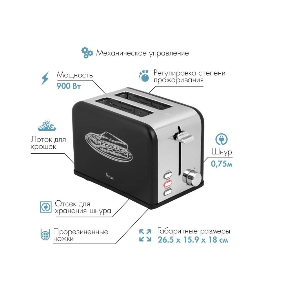 Благородный черный цвет в сочетании со стальной вставкой на корпусе заставят обратить внимание на себя Ваших гостей. Два больших отсека для тостов позволят одновременно готовить для нескольких Ваших гостей, функция автоматического центрирования тостов поможет равномерно поджарить с обеих сторон тосты. С помощью прорезиненных ножек тостер VLK Palermo 101будет устойчив на любой поверхности. При хранении тостера и экономии места предусмотрен отсек для хранения сетевого шнура. Съемный лоток для крошек упростит очистку тостера.